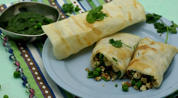 Stuff the dosa with peas mixture and gently roll it like a wrap. Serve with mint chutney.