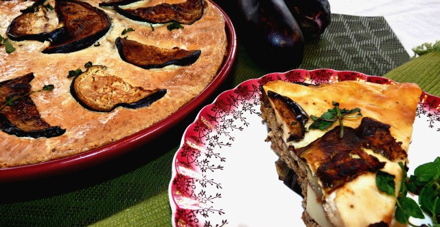 Layer the moussaka by placing on layer of eggplant followed by a layer of meat, potato mixture and another layer of grilled eggplant. Pour white sauce over the layered pie. Add some sliced eggplant and bake at 350 degrees for 30 to 40 minutes or till golden brown.