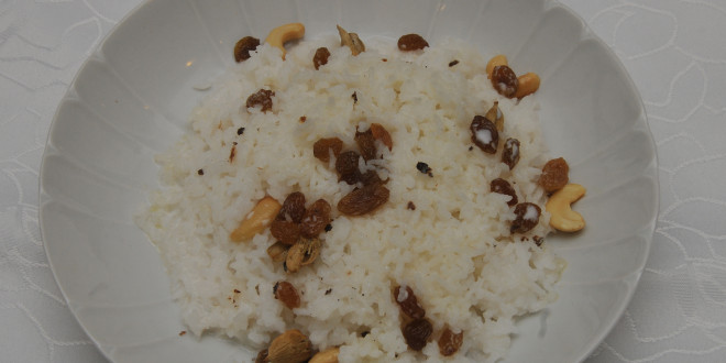 Add the sugar, thick coconut milk, crushed cardamoms, fried cashew nuts and raisins. Stir.