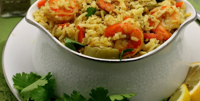 Basmati rice simmered in coconut milk with some shrimp and veggies thrown in makes a yummy easy one pot meal! This shrimp pilaf is loaded with veggies so it is a meal in itself. Throw in some milk and fruit and dinner is served!