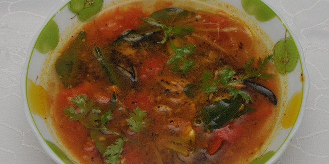 Rasam is a light broth made of tomatoes, tamarind pulp, coriander leaves, cumin, pepper, garlic. All this is crushed together and tempered with very little oil, mustard seeds, curry leaves and asafoetida. Rasam should never be boiled; the flame is to be turned off once it starts boiling. Rasam is usually served at the end of a meal: it helps digest the food.